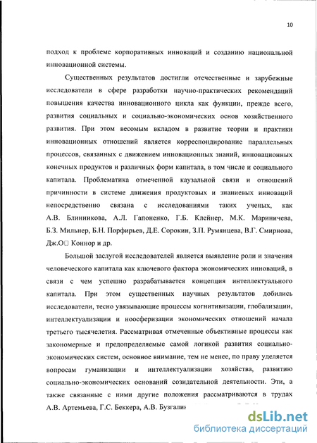 Существенных результатов достигли отечественные и зарубежные исследователи в сфере разработки научно-практических рекомендаций повышения качества инновационного цикла как функции, прежде всего, развития социальных и социально-экономических основ хозяйственного развития. При этом весомым вкладом в развитие теории и практики инновационных отношений является корреспондирование параллельных процессов, связанных с движением инновационных знаний, инновационных конечных продуктов и различных форм капитала, в том числе и социального капитала. Проблематика отмеченной каузальной связи и отношений причинности в системе движения продуктовых и знаниевых инноваций непосредственно связана с исследованиями таких ученых, как А.В. Блинникова, А.Л. Гапоненко, Г.Б. Клейнер, М.К. Мариничева, Б.З. Мильнер, Б.Н. Порфирьев, Д.Е. Сорокин, З.П. Румянцева, В.Г. Смирнова, Дж. О'Коннор и др.