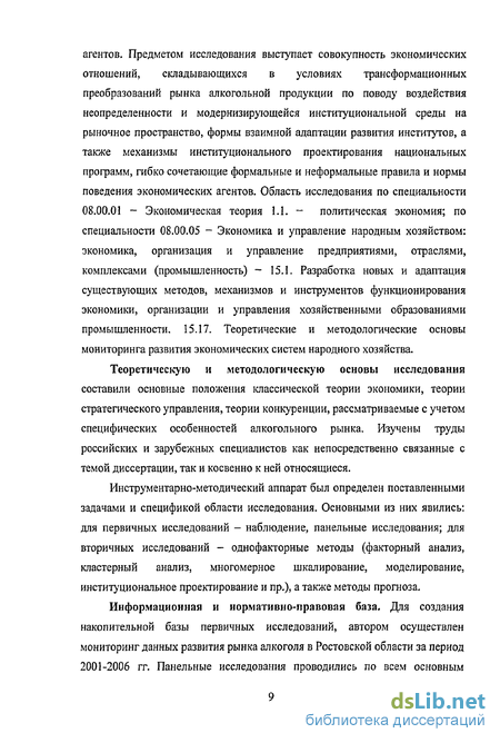 агентов. Предметом исследования выступает совокупность экономических отношений, складывающихся в условиях трансформационных преобразований рынка алкогольной продукции по поводу воздействия неопределенности и модернизирующейся институциональной среды на рыночное пространство, формы взаимной адаптации развития институтов, а также механизмы институционального проектирования национальных программ, гибко сочетающие формальные и неформальные правила и нормы поведения экономических агентов. Область исследования по специальности 08.00.01 - Экономическая теория 1.1. - политическая экономия; по специальности 08.00.05 - Экономика и управление народным хозяйством: экономика, организация и управление предприятиями, отраслями, комплексами (промышленность) - 15.1. Разработка новых и адаптация существующих методов, механизмов и инструментов функционирования экономики, организации и управления хозяйственными образованиями промышленности, 15.17. Теоретические и методологические основы мониторинга развития экономических систем народного хозяйства.