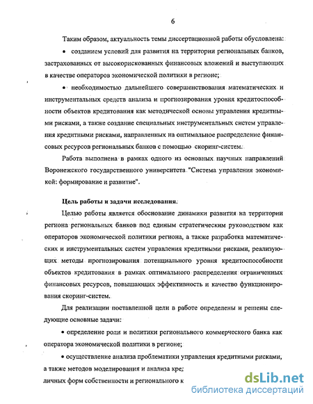 В первой главе с системных позиций проанализирована роль регионального банка как оператора экономической региональной политики, осуществлен анализ проблематики управления кредитными рисками, а также методов мониторинга и анализа кредитоспособности объектов кредитования. Сформулированы цель работы и задачи исследования.