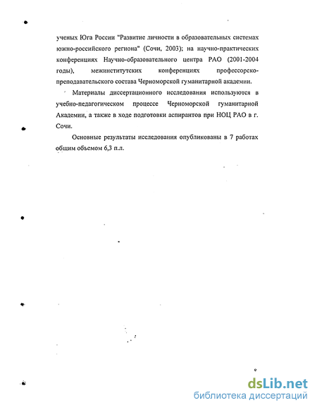 Материалы диссертационного исследования используются в учебно-педагогическом процессе Черноморской гуманитарной Академии, а также в ходе подготовки аспирантов при НОЦ РАО в г. Сочи.