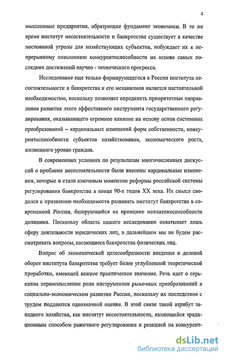 Актуальность темы исследования. Общее состояние экономической и социальной обстановки в России усиливает внимание к различным мерам, принимаемым для преодоления неблагоприятных тенденций развития. Определённую систему мер представляет государственное регулирование происходящих процессов, которое находит свое проявление в исследовании связей и факторов изменения экономических условий развития всего народного хозяйства и его реального сектора. Для российской экономики, вступившей на путь рыночных отношений, несостоятельность и банкротство является относительно новой категорией в практике хозяйственной деятельности, в то время как в мировой хозяйственной жизни эти процедуры имеют уже долгую историю.