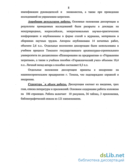 Апробация результатов работы. Основные положения диссертации и результаты проведенных исследований были раскрыты в докладах на международных, всероссийских, межрегиональных научно-практических конференциях и опубликованы в форме статей в журналах, материалов в сборниках научных трудов. Автором опубликовано 14 печатных работ, объемом 2,6 п.л.. Отдельные положения диссертации были использованы в учебном процессе Томского государственного архитектурно-строительного университета по дисциплинам «Планирование на предприятии» и «Управление затратами», а также в учебном пособии «Управленческий учет» объемом 10,4 п.л.. Личный вклад автора в пособие составляет 0,3 п.л.