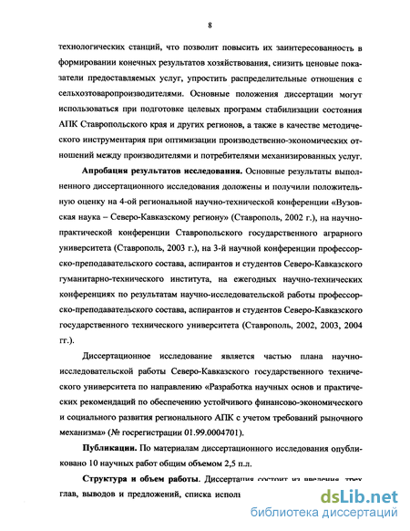 технологических станций, что позволит повысить их заинтересованность в формировании конечных результатов хозяйствования, снизить ценовые показатели предоставляемых услуг, упростить распределительные отношения с сельхозтоваропроизводителями. Основные положения диссертации могут использоваться при подготовке целевых программ стабилизации состояния АПК Ставропольского края и других регионов, а также в качестве методического инструментария при оптимизации производственно-экономических отношений между производителями и потребителями механизированных услуг.
