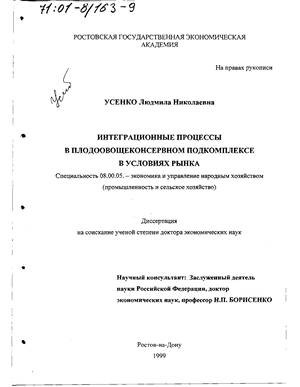 Таким образом, разработку научных основ развития интеграционных процессов вокруг консервных заводов и формирования рынка плодоовощной продукции можно отнести к числу актуальных проблем исследования АПК, как одной из сфер экономики, требующих целевого регулирования рыночных отношений.