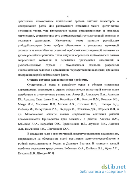 Существенный вклад в разработку основ в области управления инвестициями, реализации и оценки эффективности инвестиций внесли такие зарубежные и отечественные ученые как: Аакер Д., Алискеров В.А., Анискин Ю., Арнольд Глен, Бланк И.А., Валдайцев С.В., Власова В.М., Ковалев В.В., Мазур И.И., Маренков Н.Л., Мескон А.Х., Стоянова Е.С., Шапиро В.Д., Фабоцци Ф., Фатхутдинов Р.А., Хедоури Ф., Шевченко Д.К., Шеремет В.В., и др. Методические аспекты оценки современного состояния рыбной промышленности Приморского края освещены в работах Азизова Я.М., Бобылева Ю.А., Ворожбит О.Ю. Ерухимовича В.Б., Заусаева В.К., Латкина А.П., Немчикова В.И., Шпаченкова Ю.А.