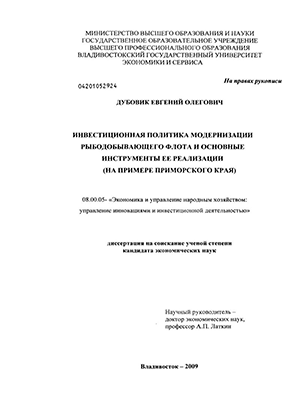 Предметом исследования являются управленческие аспекты обоснования и реализации инвестиционной политики модернизации рыбодобывающего флота Приморского края.