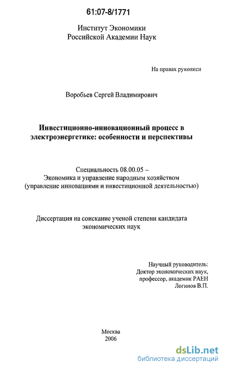 - Инвестиционный процесс в электроэнергетике в условиях инновационной экономики