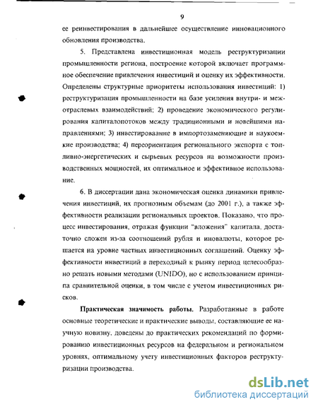 1. На основе анализа причин глубокого кризиса в экономике и социальной сфере России и ее регионов, дано теоретико-методологическое обоснование формирования инвестиционных и производственных ресурсов, инвестиционных факторов реструктуризации промышленного производства и становлении инвестиционного рынка в России. Система неотложных мер, включает реструктуризацию экономики в целом, ее сфер, отраслей и регионов, сокращение бюджетного дефицита, преодоление спада производства и валового внутреннего продукта, увеличение производственных инвестиций. Исходя из теоретической предпосылки о том, что в воспроизводственном процессе формируется фонд накопления (ресурсы инвестиций), как стратегический параметр и важный источник экономического роста (и роста производства) раскрыты проблемы рационального объема и оптимальной структуры в условиях рыночной трансформации экономики.