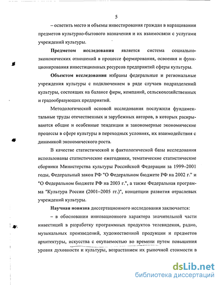 Предметом исследования является система социально-экономических отношений в процессе формирования, освоения и функционирования инвестиционных ресурсов предприятий сферы культуры.
