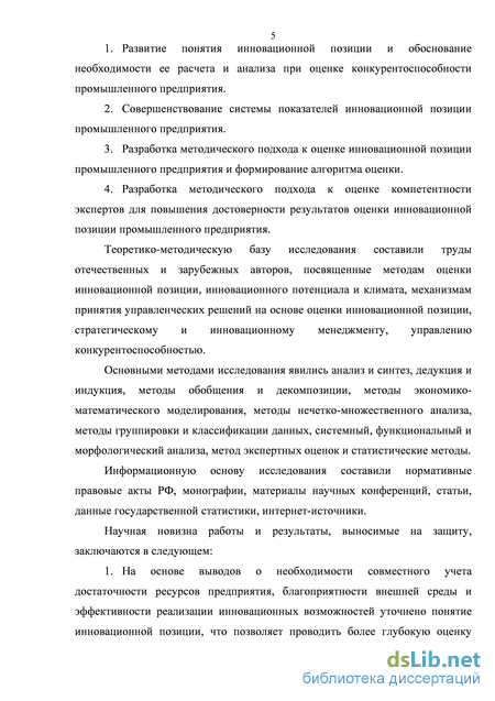 Цель и задачи диссертационного исследования. Целью диссертационного исследования является разработка методов оценки и совершенствования инновационной позиции промышленного предприятия для повышения его конкурентоспособности.