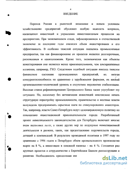 Переход России к рыночной экономике и новым условиям хозяйствования предприятий обусловил особую важность вопросов, касающихся инвестиций и управления инвестиционным процессом на предприятиях. При экономическом спаде, зафиксированном в отечественной экономике за последние годы снизился объем инвестирования и его эффективность. В особенно тяжелой ситуации оказались промышленные предприятия, так как финансирование их проектов является долгосрочным, рискованным и капиталоемким. Кроме того, экономически как объекты инвестирования они являются менее привлекательными, чем альтернативные вложения, например, ГКО. Следствием подобной ситуации явилось тяжелое финансовое состояние промышленных предприятий, их низкая конкурентоспособность по сравнению с зарубежными фирмами, их низкий организационно-технический уровень и отсутствие перспектив стабилизации. Высокая ставка рефинансирования Центрального Банка также усугубляет эту ситуацию. Но, поскольку без активизации инвестиций невозможно начать структурную перестройку промышленности, правительство и местные власти вынуждены предпринимать серьезные шаги по стимулированию инвесторов. Так, например, власти Санкт-Петербурга ведут целенаправленную политику по повышению инвестиционной привлекательности города. Разработанный проект инвестиционного законодательства для Петербурга включает многие виды налоговых льгот, а также других мер по поддержке инвестиционной деятельности в регионе, таких, как предоставление поручительств города, дотаций и компенсаций. В результате проводимой политики в 1997 году по сравнению с 1996 годом в Петербурге объем промышленного производства вырос на 8 %, а инвестиции в основной капитал - на 4 %. Готовится ряд крупных проектов в сотрудничестве с Европейским Банком реконструкции и развития. Необходимость преодоления инвестиционного кризиса в России,