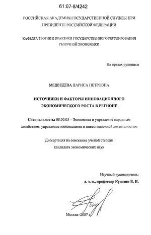 Разработка и исследование ресурсных источников и факторов инновационного экономического роста в условиях быстрого обновления технологий и разработки новых подходов к экономическому развитию становится все более злободневной проблемой, что и обусловило выбор темы диссертационного исследования.