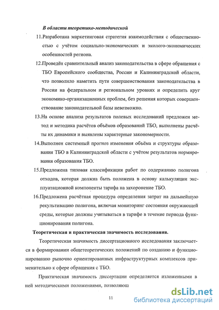обоснованы теоретико-методологические аспекты совершенствования: законодательства, налоговой системы, тарифной системы, административно-управленческой системы, а также маркетинговой стратегии в сфере обращения с ТБО;
