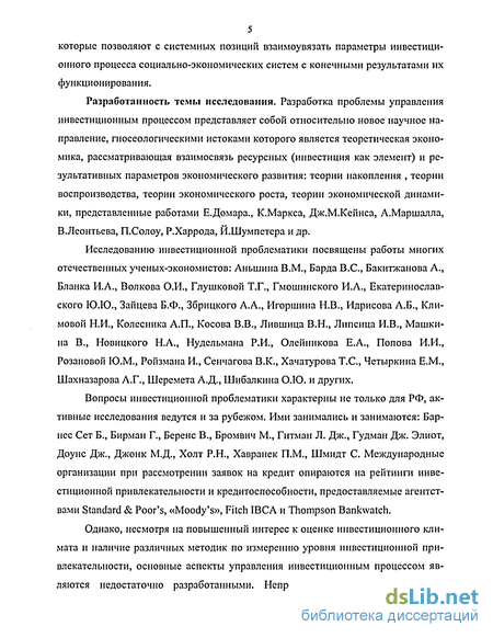 Исследованию инвестиционной проблематики посвящены работы многих отечественных ученых-экономистов: Аньшина В.М., Барда B.C., Бакитжанова А., Бланка И.А., Волкова О.И., Глушковой Т.Г., Гмошинского И.А., Екатеринослав-ского Ю.Ю., Зайцева Б.Ф., Збрицкого А.А., Игоршина Н.В., Идрисова А.Б., Климовой Н.И., Колесника А.П., Косова В.В., Лившица В.Н., Липсица И.В., Машки-на В., Новицкого Н.А., Нудельмана Р.И., Олейникова Е.А., Попова И.И., Розановой Ю.М., Ройзмана И., Сенчагова В.К., Хачатурова Т.С., Четыркина Е.М., Шахназарова А.Г., Шеремета А.Д., Шибалкина О.Ю. и других.