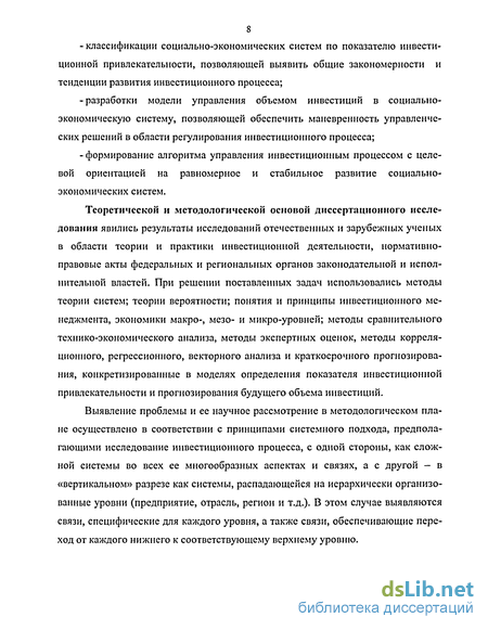 Теоретической и методологической основой диссертационного исследования явились результаты исследований отечественных и зарубежных ученых в области теории и практики инвестиционной деятельности, нормативно-правовые акты федеральных и региональных органов законодательной и исполнительной властей. При решении поставленных задач использовались методы теории систем; теории вероятности; понятия и принципы инвестиционного менеджмента, экономики макро-, мезо- и микро-уровней; методы сравнительного технико-экономического анализа, методы экспертных оценок, методы корреляционного, регрессионного, векторного анализа и краткосрочного прогнозирования, конкретизированные в моделях определения показателя инвестиционной привлекательности и прогнозирования будущего объема инвестиций.