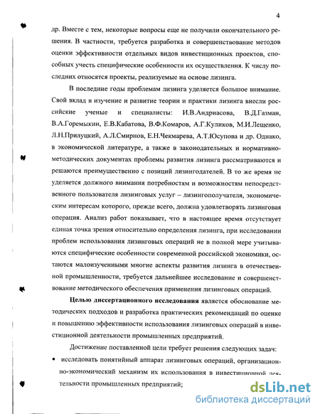 Целью диссертационного исследования является обоснование методических подходов и разработка практических рекомендаций по оценке и повышению эффективности использования лизинговых операций в инвестиционной деятельности промышленных предприятий.