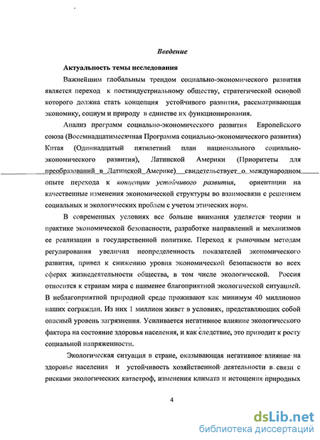 В современных условиях все больше внимания уделяется теории и практике экономической безопасности, разработке направлений и механизмов государственной политики по ее повышению. Это связано с тем, что переход к рыночным методам регулирования увеличил неопределенность показателей экономического развития, привел к снижению уровня экономической безопасности во всех сферах жизнедеятельности общества, в том числе экологической. Россия относится к странам мира с наименее благоприятной экологической ситуацией. В неблагоприятной природной среде проживают как минимум 40 миллионов наших сограждан. Из них 1 миллион живет в условиях, представляющих собой опасный уровень загрязнения. Усиливается негативное влияние экологического фактора на состояние здоровья населения, и как следствие, это приводит к росту социальной напряженности.