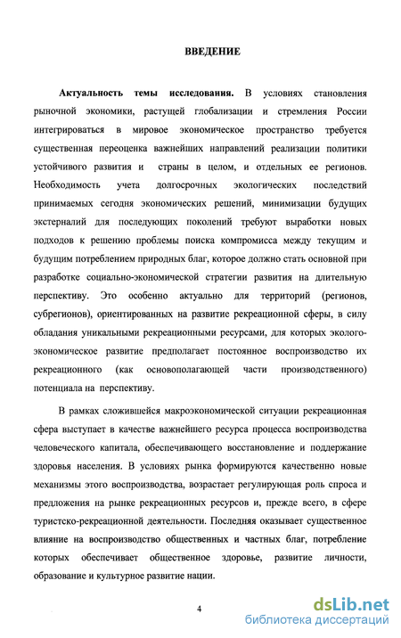Актуальность темы исследования. В условиях становления рыночной экономики, растущей глобализации и стремления России интегрироваться в мировое экономическое пространство требуется существенная переоценка важнейших направлений реализации политики устойчивого развития и страны в целом, и отдельных ее регионов. Необходимость учета долгосрочных экологических последствий принимаемых сегодня экономических решений, минимизации будущих экстерналий для последующих поколений требуют выработки новых подходов к решению проблемы поиска компромисса между текущим и будущим потреблением природных благ, которое должно стать основной при разработке социально-экономической стратегии развития на длительную перспективу. Это особенно актуально для территорий (регионов, субрегионов), ориентированных на развитие рекреационной сферы, в силу обладания уникальными рекреационными ресурсами, для которых эколого-экономическое развитие предполагает постоянное воспроизводство их рекреационного (как основополагающей части производственного) потенциала на перспективу.