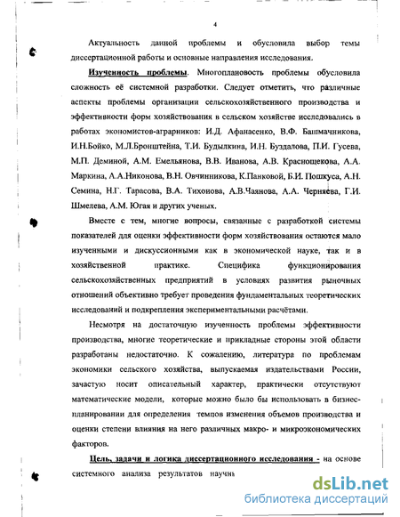 Изученность проблемы. Многоплановость проблемы обусловила сложность её системной разработки. Следует отметить, что различные аспекты проблемы организации сельскохозяйственного производства и эффективности форм хозяйствования в сельском хозяйстве исследовались в работах экономистов-аграрников: И.Д. Афанасенко, В.Ф. Башмачникова, ИН.Бойко, М.Л.Бронштейна, Т.И. Будылкина, И.Н. Буздалова, П.И. Гусева, М.П. Деминой, A.M. Емельянова, В.В. Иванова, А.В. Краснощекова, А.А. Маркина, А.А.Никонова, В.Н. Овчинникова, К.Панковой, Б.И. Пошкуса, А.Н. Семина, Н.Г. Тарасова, В.А. Тихонова, А.В.Чаянова, А.А. Черняева, Г.И. Шмелева, A.M. Югая и других ученых.