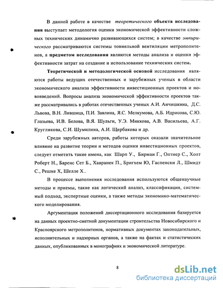 В данной работе в качестве теоретического объекта исследования выступает методология оценки экономической эффективности сложных технических динамично развивающихся систем; в качестве эмпирического рассматриваются системы тоннельной вентиляции метрополитенов, а предметом исследования являются методы анализа и оценки эффективности затрат на создание и использование технических систем.