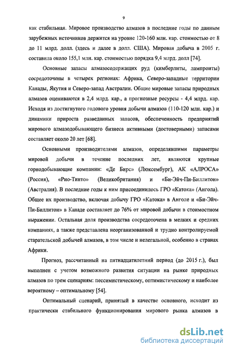 Актуальность темы исследования. В экономике Российской Федерации алмазы входят в число основных стратегических ресурсов, формирующих значительную долю валового национального продукта и валютных поступлений страны. При любых достижениях в области реформирования промышленности, усиление позиций России на мировом рынке алмазов будет оставаться приоритетной государственной задачей на длительную перспективу.