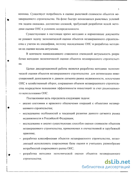 Целью диссертационной работы является разработка методики экономической оценки объектов незавершенного строительства для активизации инвестиционной деятельности в данном сегменте рынка недвижимости, вовлечения ОНС в хозяйственный оборот, сокращения объемов незавершенного строительства посредством повышения эффективности инвестиций за счет рационального использования ОНС.