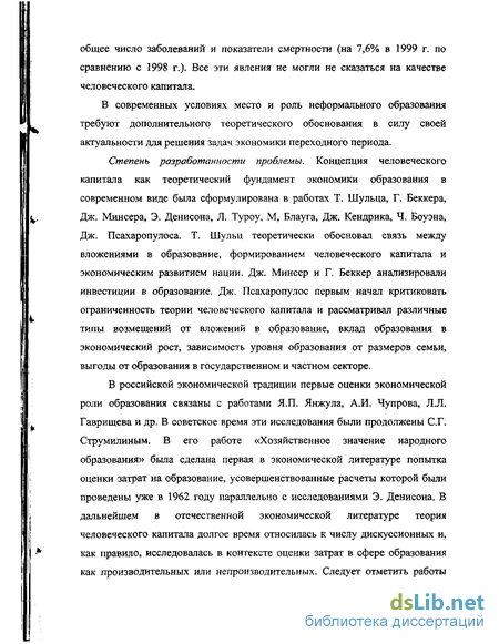 Степень разработанности проблемы. Концепция человеческого капитала как теоретический фундамент экономики образования в современном виде была сформулирована в работах Т. Шульца, Г. Беккера, Дж. Минсера, Э. Денисона, Л. Туроу, М, Блауга, Дж. Кендрика, Ч. Боуэна, Дж. Псахаропулоса. Т. Шульц теоретически обосновал связь между вложениями в образование, формированием человеческого капитала и экономическим развитием нации. Дж. Минсер и Г. Беккер анализировали инвестиции в образование. Дж. Псахаропулос первым начал критиковать ограниченность теории человеческого капитала и рассматривал различные типы возмещений от вложений в образование, вклад образования в экономический рост, зависимость уровня образования от размеров семьи, выгоды от образования в государственном и частном секторе.