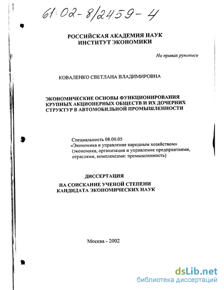разработка практических предложений и рекомендаций по совершенствованию организационно - экономического механизма функционирования дочерних предприятий в структуре крупных акционерных обществ отечественного автомобилестроения.