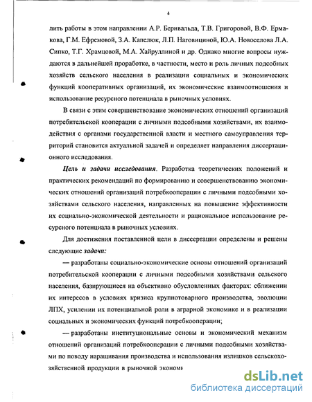 Цель исследования. Разработка теоретических положений и практических рекомендаций по формированию и совершенствованию экономических отношений организаций потребкооперации с личными подсобными хозяйствами сельского населения, направленных на повышение эффективности их социально-экономической деятельности и рациональное использование ресурсного потенциала в рыночных условиях.