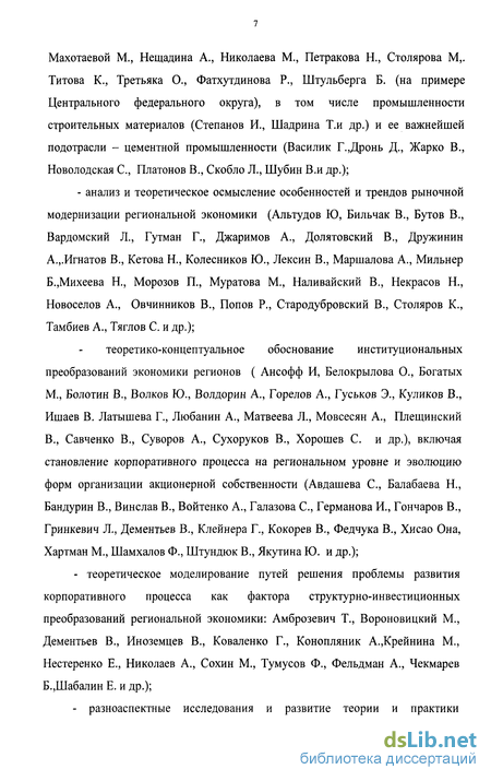 теоретико-концептуальное обоснование институциональных преобразований экономики регионов ( Ансофф И, Белокрылова О., Богатых М., Болотин В., Волков Ю., Волдорин А., Горелов А., Гуськов Э., Куликов В., Ишаев В. Латышева Г., Любанин А., Матвеева Л., Мовсесян А., Плещинский В., Савченко В., Суворов А., Сухоруков В., Хорошев С. и др.), включая становление корпоративного процесса на региональном уровне и эволюцию форм организации акционерной собственности (Авдашева С, Балабаева Н., Бандурин В., Винслав В., Войтенко А., Галазова С, Германова И., Гончаров В., Гринкевич Л., Дементьев В., Клейнера Г., Кокорев В., Федчука В., Хисао Она, Хартман М., Шамхалов Ф., Штундюк В., Якутина Ю. и др.);
