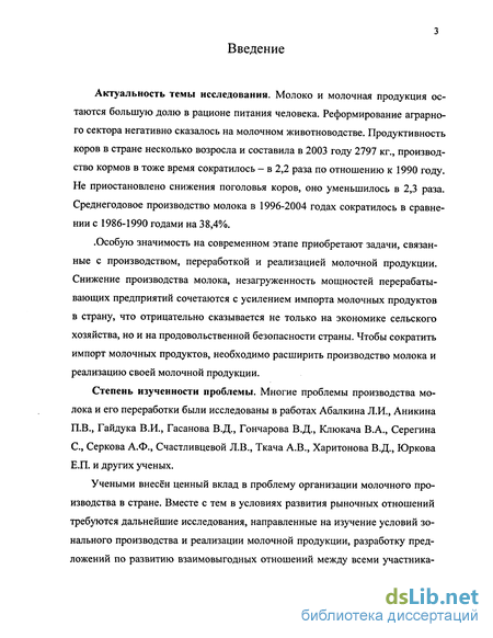 Актуальность темы исследования. Молоко и молочная продукция остаются большую долю в рационе питания человека. Реформирование аграрного сектора негативно сказалось на молочном животноводстве. Продуктивность коров в стране несколько возросла и составила в 2003 году 2797 кг., производство кормов в тоже время сократилось - в 2,2 раза по отношению к 1990 году. Не приостановлено снижения поголовья коров, оно уменьшилось в 2,3 раза. Среднегодовое производство молока в 1996-2004 годах сократилось в сравнении с 1986-1990 годами на 38,4%.