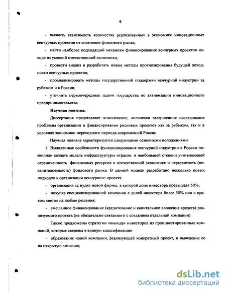 Диссертация представляет комплексное, логически завершенное исследование проблемы организации и финансирования рисковых проектов как за рубежом, так и в условиях экономики переходного периода современной России.