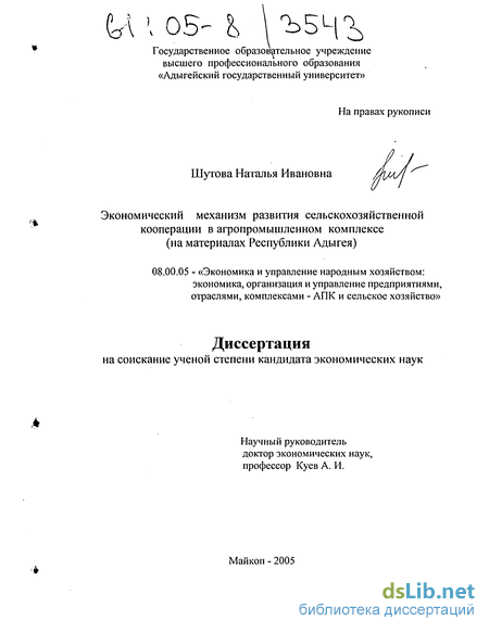 Предметом исследования является организационно-экономический механизм развития сельскохозяйственной кооперации, обеспечивающий эффективность деятельности сельскохозяйственных производственных кооперативов.