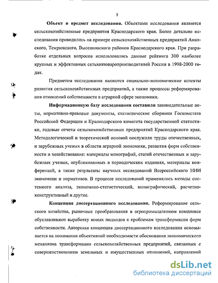 5 Объект и предмет исследования. Объектами исследования являются сельскохозяйственные предприятия Краснодарского края. Более детально исследования проводились на примере сельскохозяйственных предприятий Анапского, Темрюкского, Выселковского районов Краснодарского края. При разработке отдельных вопросов использовались данные рейтинга 300 наиболее крупных и эффективных сельхозтоваропроизводителей России в 1998-2000 годах.