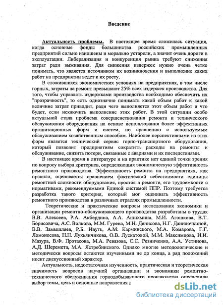 Актуальность, недостаточная изученность, практическая и теоретическая значимость вопросов научной организации и экономики ремонтно-технического обслуживания горнодобывающего производства определили выбор темы, цель и основные направления данного исследования.
