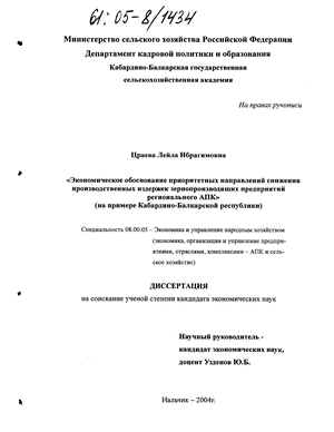 В третьей главе «Стратегия снижения производственных издержек предприятий отрасли в Кабардино-Балкарской республики» на примере сельскохозяйственных предприятий Кабардино-Балкарской республики предлагаются основные направления снижения производственных издержек, а также научно-обоснованная прогнозная модель снижения себестоимости производства продукции зерновой отрасли.