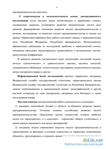 В теоретическую и методологическую основу диссертационного исследования легли научные труды отечественных и зарубежных ученых, посвященные вопросам устойчивого развития экономических систем всех уровней, формированию механизма развития малого предпринимательства в регионе, исследования по развитию малого предпринимательства и оценке его уровня. Нормативно-правовую базу работы составили законы и законодательные акты Российской Федерации, Республики Башкортостан. Использовались официальные публикации по исследуемой проблеме в периодической печати, материалы ежегодных международных, всероссийских и региональных научно-практических конференций. В процессе решения поставленных задач использован системный подход, методы стратегического и сравнительного анализа, научных аналогий, эмпирического обобщения, статистических группировок, регрессионного анализа, метод экспертного опроса и др.