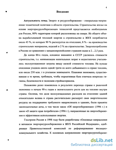 Актуальность темы. Энерго- и ресурсосбережение - генеральное направление технической политики в области строительства. Строительство жилья на основе энергоресурсосберегающих технологий представляется необходимым для России, 80% территории которой расположены на севере. Из общего объема вырабатываемой тепловой энергии в строительстве и ЖКХ потребляется около 43 %, из которых 90 % расходуется на отопление, 8 % - на производство строительных материалов, изделий и 2 % на строительство. Энергопотребление в России по сравнению с западноевропейскими странами выше в 2...2,5 раза.