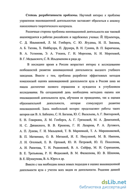 Различные стороны проблемы инновационной деятельности как таковой анализируются в работах российских и зарубежных ученых: Й. Шумпетера, С. Д. Ильенковой, Л. М. Гохберга, С. Ю. Ягудина, И. П. Завлина,