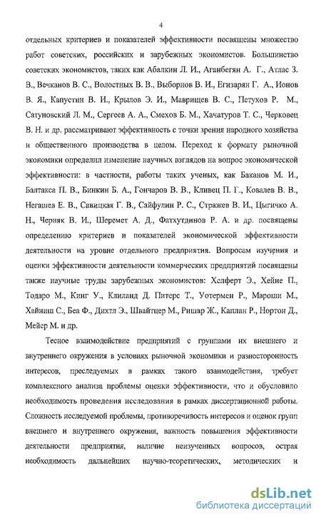 4 отдельных критериев и показателей эффективности посвящены множество работ советских, российских и зарубежных экономистов. Большинство советских экономистов, таких как Абалкин Л. И., Аганбегян А. Г., Аглае 3. В., Вечканов В. С, Волостных В. В., Выборнов В. И., Егизарян Г. А., Ионов В. Я., Капустин В. И., Крылов Э. И., Маврищев В. С, Петухов Р. М., Сатуновский Л. М, Сергеев А. А., Смехов Б. М, Хачатуров Т. С, Черковец В. Н. и др. рассматривают эффективность с точки зрения народного хозяйства и общественного производства в целом. Переход к формату рыночной экономики определил изменение научных взглядов на вопрос экономической эффективности: в частности, работы таких ученых, как Баканов М. И., Балтакса П. В., Бинкин Б. А., Гончаров В. В., Кливец П. Г., Ковалев В. В., Негашев Е. В., Савицкая Г. В., Сайфуяин Р. С, Стражев В. И., Цыгичко А. Н., Черняк В. И., Шеремет А. Д., Фатхутдинов Р. А. и др. посвящены определению критериев и показателей экономической эффективности деятельности на уровне отдельного предприятия. Вопросам изучения и оценки эффективности деятельности коммерческих предприятий посвящены также научные труды зарубежных экономистов: Хелферт Э,, Хейне П., Тодаро М., Кинг У., Клиланд Д. Питере Т., Уотермен Р.. Мароши М., Хайниш С, Беа Ф., Дихтл Э., Швайтцер М., Ришар Ж., Каплан Р., Нортон Д., Мейср М. и др.