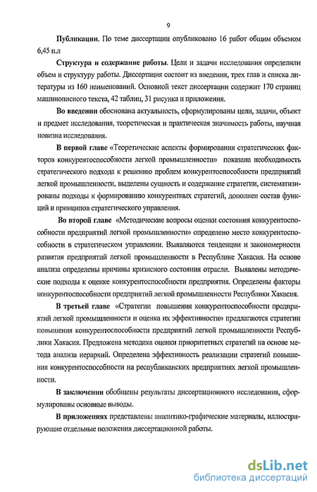Цель и задачи исследования. Целью диссертационного исследования является разработка методических основ выбора и реализации стратегий, повышающих конкурентоспособность предприятий легкой промышленности Республики Хакасия.