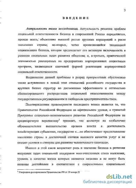 Актуальность темы исследования. Актуальность решения проблем социальной ответственности бизнеса в современной России определяется, прежде всего/ объективно высокой ролью крупных корпораций в росте экономики страны; во-вторых, четко проявляющейся тенденцией социализации бизнеса, которая предполагает его активную включенность в решение социальных, задач развития общества; и, в-третьих, практической значимостью реализуемых на предприятиях корпоративных социальных программ, являющихся ключевой формой реализации корпоративной социальной ответственности.