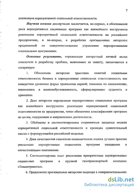 Научная новизна диссертации заключается, во-первых, в обосновании роли корпоративных социальных программ как важнейшего инструмента реализации корпоративной социальной ответственности на российских предприятиях, и во-вторых, в разработке оригинальных авторских предложений по совершенствованию управления корпоративными социальными программами.