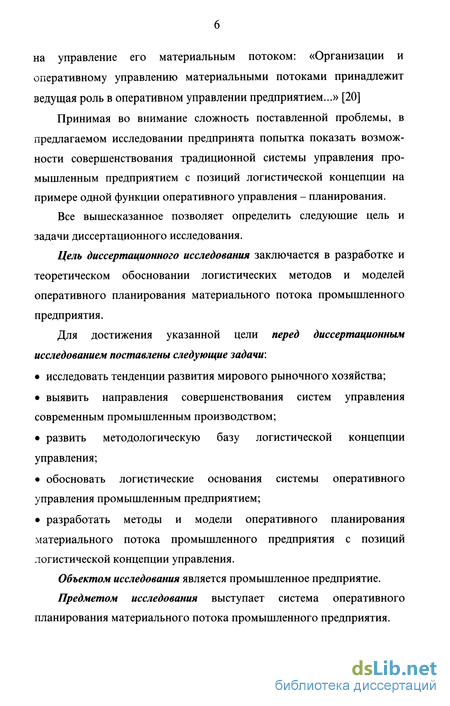 Цель диссертационного исследования заключается в разработке и теоретическом обосновании логистических методов и моделей оперативного планирования материального потока промышленного предприятия.