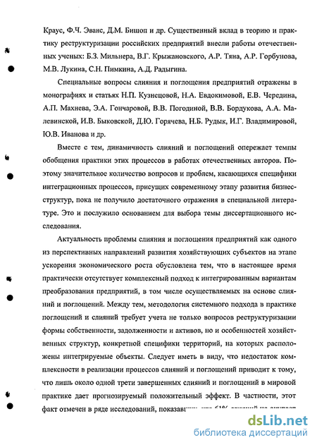 Специальные вопросы слияния и поглощения предприятий отражены в монографиях и статьях Н.П. Кузнецовой, Н.А. Евдокимовой, Е.В. Чередина, А.П. Махнева, Э.А. Гончаровой, В.В. Погодиной, В.В. Бордукова, А.А. Ма-левинской, И.В. Быковской, Д.Ю. Горячева, Н.Б. Рудык, И.Г. Владимировой, Ю.В. Иванова и др.
