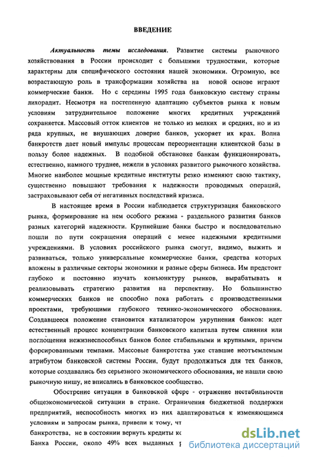 Актуальность темы исследования. Развитие системы рыночного хозяйствования в России происходит с большими трудностями, которые характерны для специфического состояния нашей экономики. Огромную, все возрастающую роль в трансформации хозяйства на новой основе играют коммерческие банки. Но с середины 1995 года банковскую систему страны лихорадит. Несмотря на постепенную адаптацию субъектов рынка к новым условиям затруднительное положение многих кредитных учреждений сохраняется. Массовый отток клиентов не только из мелких и средних, но и из ряда крупных, не внушающих доверие банков, ускоряет их крах. Волна банкротств дает новый импульс процессам переориентации клиентской базы в пользу более надежных. В подобной обстановке банкам функционировать, естественно, намного труднее, нежели в условиях развитого рыночного хозяйства. Многие наиболее мощные кредитные институты резко изменяют свою тактику, существенно повышают требования к надежности проводимых операций, застраховывают себя от негативных последствий кризиса.