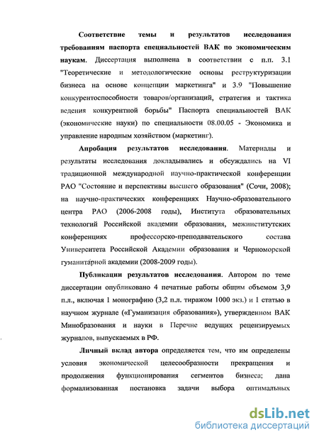 Полученные в диссертации результаты являются вкладом в развитие теоретических и методологических основ реструктуризации бизнеса на основе концепции маркетинга (п. 3.1 Паспорта специальности) и методологии решения задач повышения конкурентоспособности товаров и организаций, совершенствования методов и форм ценовой и неценовой конкуренции на рынке товаров и услуг (п. 3.9 Паспорта специальности).