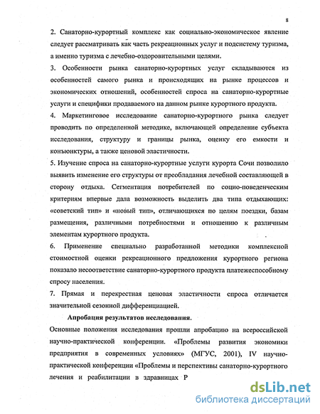 Практическая значимость исследования. Полученные автором результаты исследований имеют практическое значение для предприятий и учреждений санаторно-курортной отрасли страны, адаптирующих свою экономическую деятельность к условиям рынка. Разработанные автором методические рекомендации по внедрению маркетинговых исследований рынка в практику работы организаций рекреационной сферы могут помочь руководителям отрасли, работникам курортных администраций профессионалам туристского бизнеса в совершенствовании управления и повышении эффективности их деятельности. Материалы диссертации могут быть использованы в процессе преподавания соответствующих дисциплин в высших и средних специальных учебных заведениях курортного и туристского профиля.