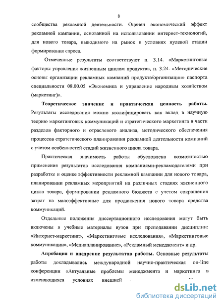 Теоретическое значение и практическая ценность работы. Результаты исследования можно квалифицировать как вклад в научную теорию маркетинговых коммуникаций и стратегического маркетинга в части разделов факторного и отраслевого анализа, методического обеспечения процессов стратегического планирования рекламной деятельности компаний с учетом особенностей стадий жизненного цикла товара.