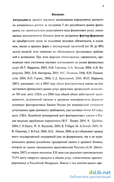 циальных и открытых литературных источников (Н.Д. Лисовой, 2001; Л.В. Бунчужный, 2002; К.С. Валеговский, 2003; М.М. Пенчура, 2004; С.А. Крестникова, 2005; Г.Л. Протасова, 2006; K.Schneider, W. Rodgers, 2000; М. Segal, F. Hekmat, 2004; J.P. Liefeld, 2005; et al.) позволяет констатировать не только всё возрастающий интерес различных социальных слоев предпринимательского сообщества к маркетинговым программам рыночного факторинга, но и отсутствие единого методологического подхода у российских и зарубежных кредитных организаций к проблеме факторинга, что потребовало осуществления дополнительных собственных научных разработок по затронутой тематике.